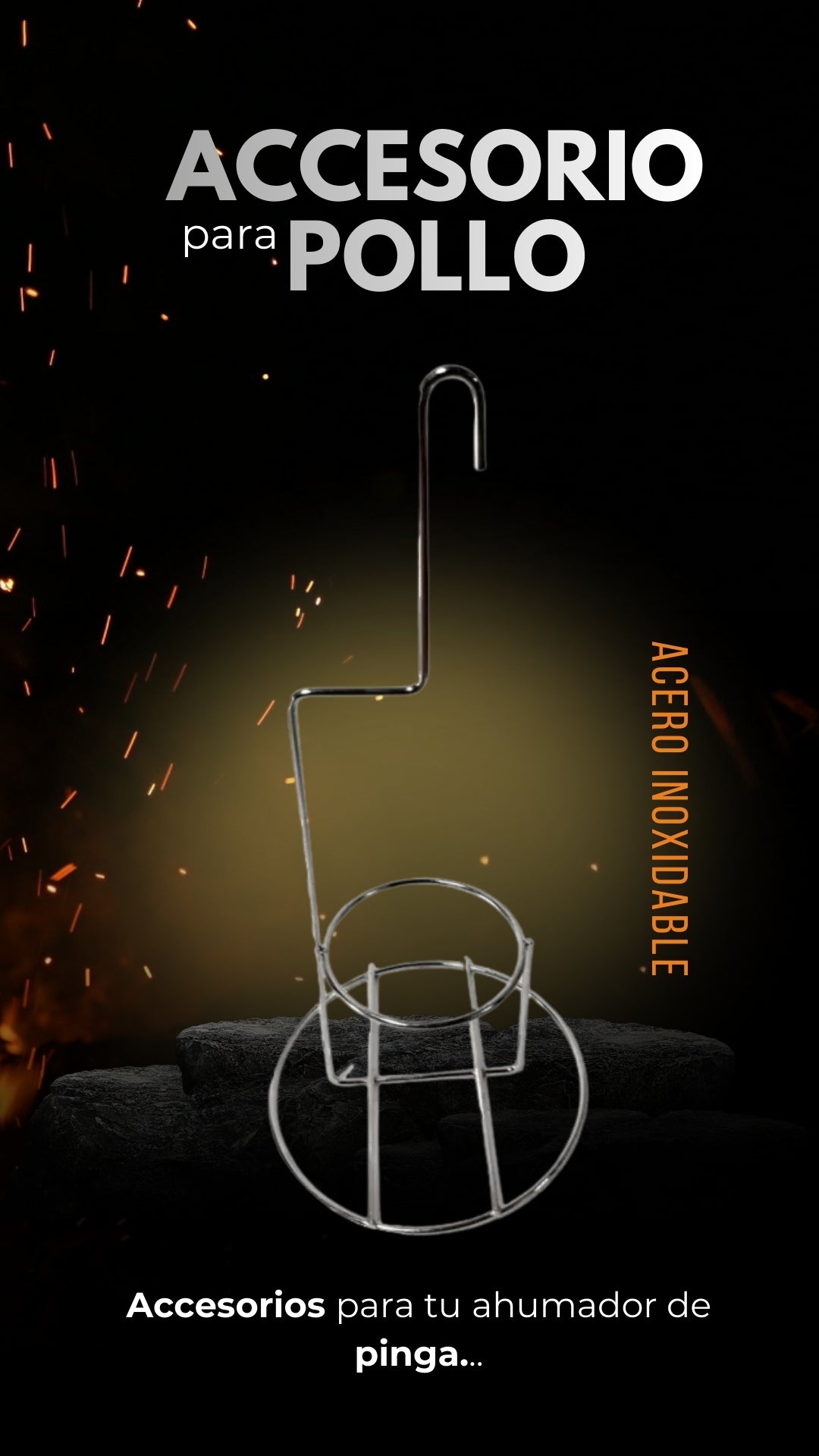 Accesorio para hacer pollo en el barril. Fabricado en varilla de acero con acabado cromado.